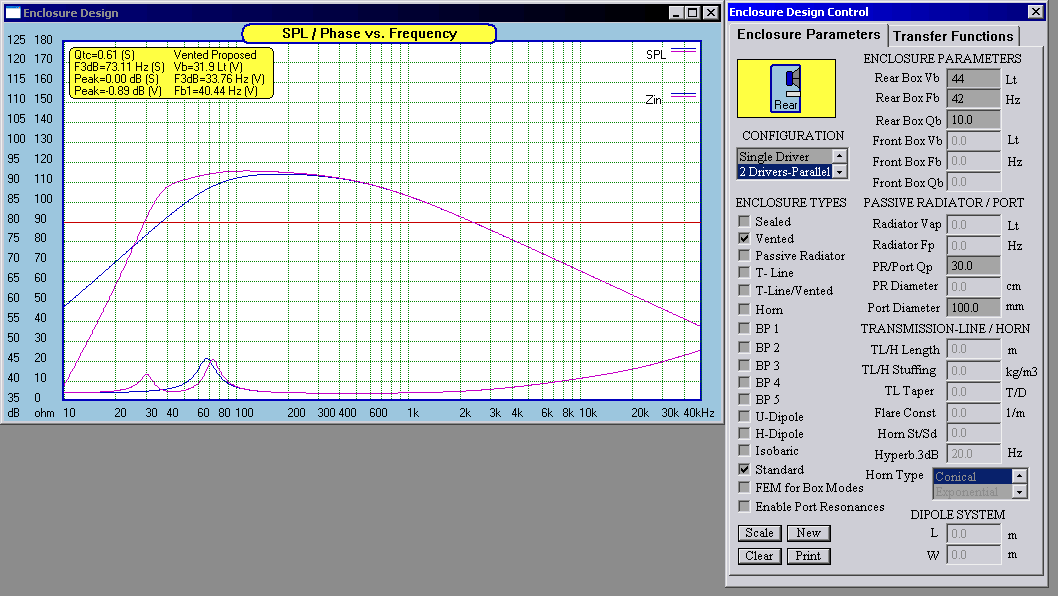 While I did not put together a vented anechoic curve, (a tedious pain in the ass to do right) rest assured that it would be the same except +3dB at 100 Hz and +8dB at 40 Hz. If that +8dB at 40Hz happens to line up major room node peak, get ready to plug those ports. Bass models are for both vented and sealed are shown further below for comparison.