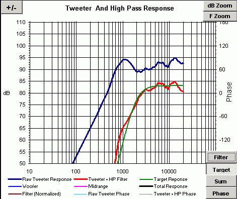 You may even decide that you would prefer a different overall sensitivity. If you add a subwoofer at some point, this could be helpful since you may want to eliminate the peak that was created at the woofer low end due to the limited extension. This would be accomplished by raising the overall sensitivity, but would require a nearly complete re-design of the crossover. The natural sensitivity that would yield the flattest overall response for such use would be around 85db. Keep in mind that this won't take other factors into account such as floor bounce, but that's another topic altogether and won't be adressed in these pages.