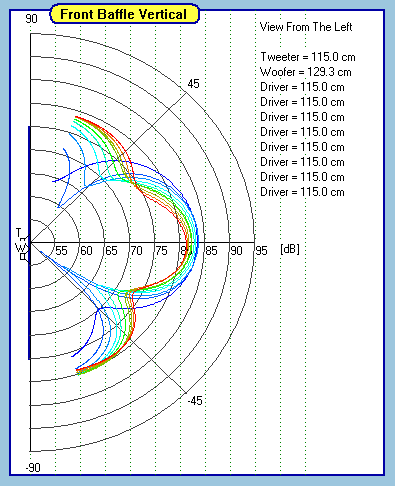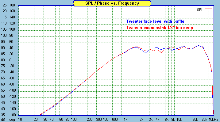Centering the tweeter is a big design choice for this system. Many people prefer to offset the tweeter while some prefer it centered. The fact is, one is not better than the other, but it does make a difference in how you optimize the system. By nature, an offset tweeter on the baffle will have the smoothest response on axis while a centered tweeter will be a little rougher on axis but smoother off axis. You'll see why in the measured off axis plots below.