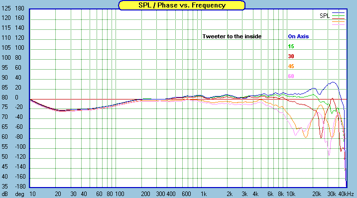 The measured off axis curves give you a little more insight into why I selected an on-axis response curve with a slight rise in the top two octaves. It flattens out almost perfectly a few degrees off axis. You don't have to have the tweeters pointing directly at you in this design. Generally it's not going to matter much if the tweeters go to the inside or outside, but I would lean towards tweeters to the inside. Off axis response through the crossover region is almost perfectly smooth.
