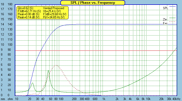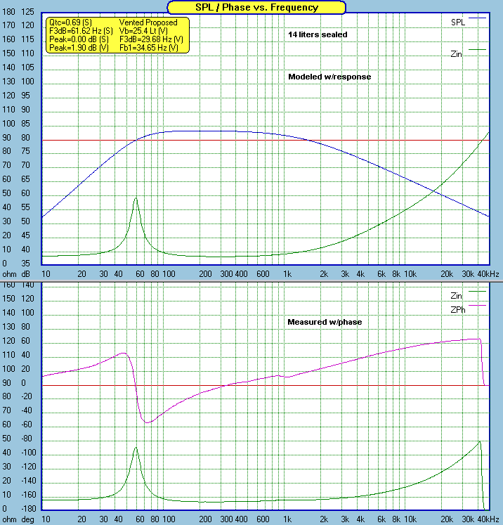 The design enclosure is 14 liters (.5 cu ft) and the measured in-box woofer impedance shows up exactly as modeled. The only real difference is the top end of the impedance curve, since the model doesn't contain enough detail to properly predict the upper end of the impedance of a complex faraday shielded motor. Mainly, the model just has a simple Le rating when there's much more to it than that. Of course I use the measured impedance for designing, so no worries.