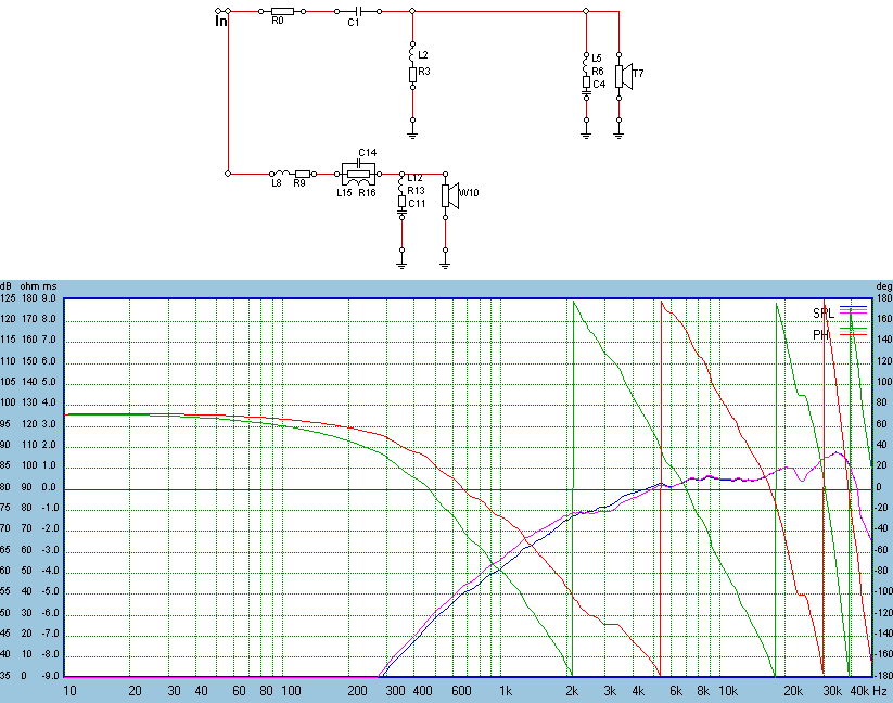 This circuit, as optimized does have a minor shaping effect on the response curve which hits LR2 dead on. In the image above, blue is the response with the delay network, and purple is without. But the primary effect is an 80 degree phase shift at the crossover point. The green phase curve is with the delay network and the red is without. In a no compromise design, the complexity and cost of this circuit is not a hindrance.