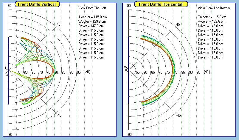 The transfer functions are relatively smooth, and you can see the response shaping the filters provide. The reverse null is wide, symmetrical and deep which is a good sign of a nice LR2 design. But an even better sign of a good LR2 crossover is a vertical polar response that is smooth and symmetrical. I can tell you that is almost impossible to achieve what you see here in a flat baffle LR2 speaker without a ladder delay network. The design listening axis is ears level or slightly above the tweeter.