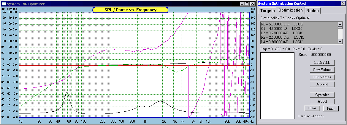 We're closer to done but not quite there. The rest of the optimization is done by hand. Changing values of individual components and then referring to the on axis response, vertical polar response, individual driver response and the reverse null shows us what the effects are. Move on to another component and repeat, revisting components as required. Reaching perfection from this point takes some time. After all the tweaking inside Soundeasy, some real listening may cause you to re-evaluate your design goals and head back to the drawing board. After some experience pushing out designs, the amount of real listening testing decreases as you learn how to reach your goals from within the initial design phase.