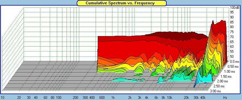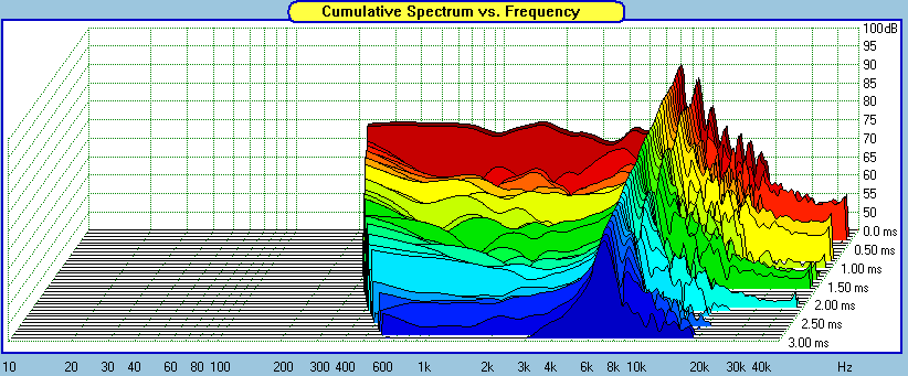 Nothing too surprising about the CSD. The cone rings like the liberty bell at 7Khz but is well behaved in the midrange. This driver's THD is what makes it special. Other drivers like the old L18 and the current Excel W18 have the breakup node in the 4-5kHz range. Observe the W18 distortion plot in the lower right corner of this spec sheet. A breakup node of 4.2kHz directly correlates to a peak in 3rd harmonic distortion 1.6kHz. Sharp peaks at a particular frequency will always cause a peak in the 3rd harmonic distortion plot roughly 2 octaves below. Notching out the breakup node is not enough to get rid of its effects. The only way to avoid it completely is to cross over below the frequency where the peak is not excited as a harmonic. With the L18 and W18, that means crossing over at 1.5kHz or lower. Many designs don't do this, and the sound is artificially colored as a result. It's most obvious with a solo piano. For a nifty test of this, set up a W18 system with a crossover frequency of 3kHz, and a perfect LR4 response. Play a recording that runs up the notes. When you get in the range of F6, F6# and G6, the piano will suddenly become completely unnatural sounding. In most recordings however, something like this is somewhat masked, and rather than sound unnatural, the music just changes character a bit. It's still noticeable however.