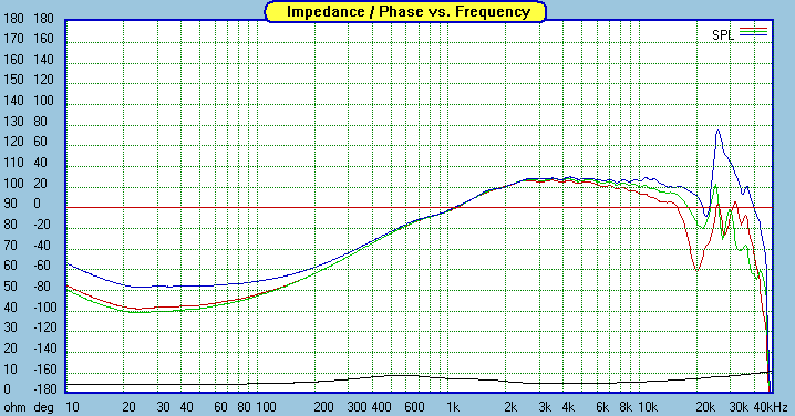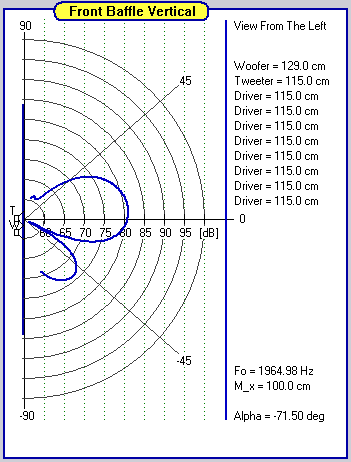 The design axis for this project is ears level with the tweeter, or slightly above. On paper (or on screen) the notch completely kills all breakup. In reality, it doesn't quite work as well as on paper, but still effective enough. The vertical off axis chart is a good estimation of the vertical listening window. Vertically +30/-20 degrees will still result in flat response, by +40/-30 the null has shown up and by +50/-40 degrees the tweeter is completely out of phase with the woofer. The vertical window is by design very tall. This is not a speaker that will lose any of it's midrange when you stand up, and the midrange floor reflection at a typical listening position is reduced from the -40 degree null. It works out well.