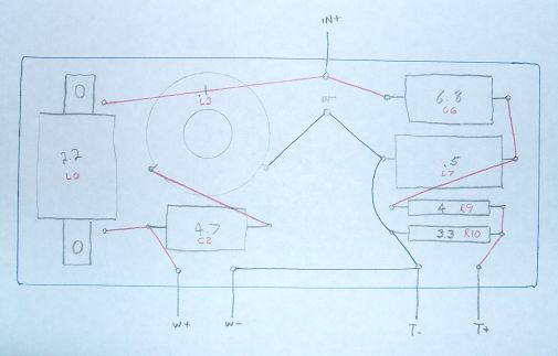 I've included images of my crossover boards. I like things tidy. For me, that meant lining components up on the front side, and using bus wire for jumpers on the back side. I used a single board for both the woofer and tweeter sections, but I located the tweeter coil at the far end of the board to avoid electromagnetic interaction. The big steel laminate inductor has screw holes that are handy for bolting it in place, and the others are epoxied. I mounted the board on the side, near the back.