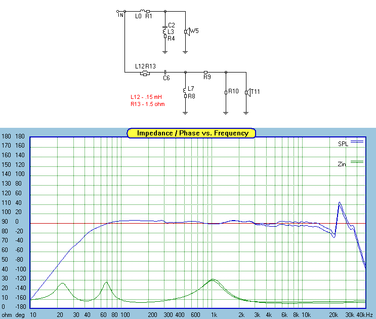 The single notch is a precision strike on the main 7kHz peak, and greatly reduces most of the garbage peaks above it. I would call this a "bottomless" notch due to the lack of resistor in the circuit. The only resistance is in the inductor. Notches of this nature are inherently high Q and deep, but it still took some tweaking of the values to position the notch correctly and still help out with the woofer's required rolloff.