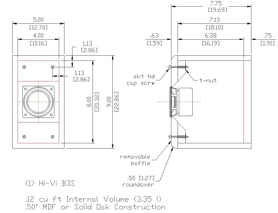 This design came about directly as a result of a large comparison test of small wide range drivers that I did. The Hi-Vi B3S was one of the best and I felt it was the one to finally replace the popular Tangband W3-871 system I had on this web site. The TB W3-871 popularity was almost ironic to me, since I'm not a big fan of full range drivers. You'll never find me running larger full range drivers because I think they generally have too many problems that degrade the sound. But the 3" wide range is another story - they are large enough to blend well with a subwoofer, but small enough to have high frequency extension and off axis response that doesn't stink. 2" drivers are too small, with poor low end extension, distortion and power handling problems. With those you end up with the typical "Blose" sound - no midbass, and a sub that's easily locatable due to a crossover that is too high. 4" or larger drivers can integrate well with a sub, but lack high frequency resolution, have terrible off axis response and have breakup nodes too low in frequency. That leaves us with 3" drivers, the magic size.