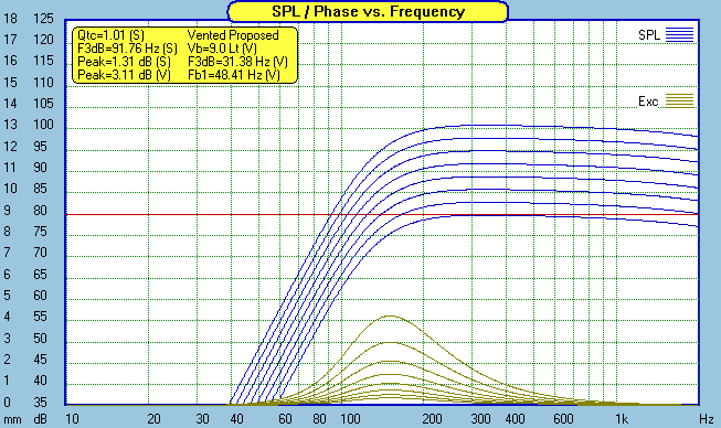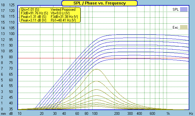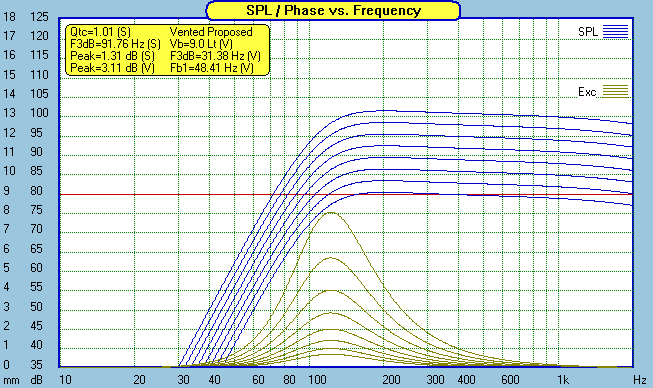 With teeny weenie drivers like this, nothing is of bigger importance than power handling. The charts above are power doubling, starting at 1 watt, then 2 watts, then 4 watts, and on up to 128 watts. Careful, the 3mm Xmax shows up quickly. Running full range, don't expect to pump more than a few watts into it. You will exceed Xmax with 8 watts at 90hz. A Sonic Impact T-amp would make a nice combo for a nearfield or low level listening system. But for home theater or any other "room filling" sound, you had better start paying attention to the subwoofer crossover if you expect to get any reasonable loudness out of this system. Note: Thanks to John Kreskovsky for showing me how to set up filters in the Soundeasy enclosure design module so I can accurately look at Xmax issues when used with a sub.