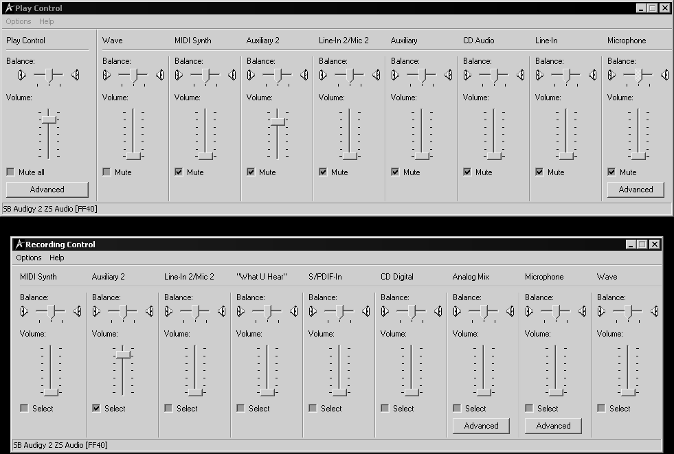 My current hardware, as of 05/09/2005: P4/3Ghz, 1 gig ram, Creative Labs Audigy 2 ZS Platinum. This is the version that has the drive-bay mounted panel. This panel has a pair of RCA input jacks for Auxiliary 2, which is what I use for my testing probes.