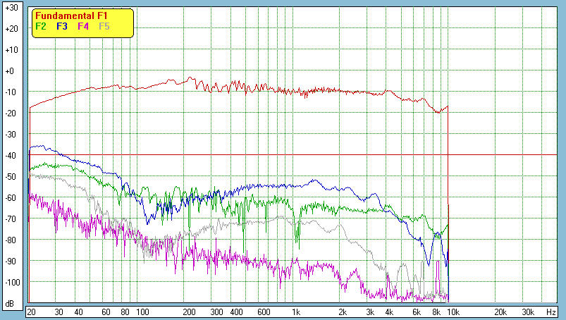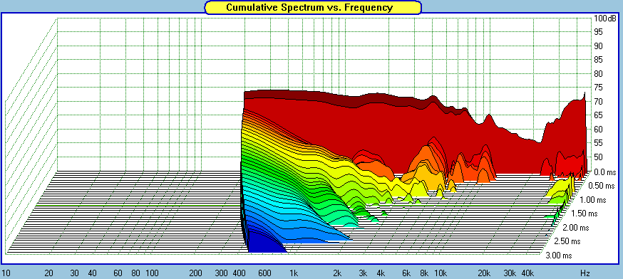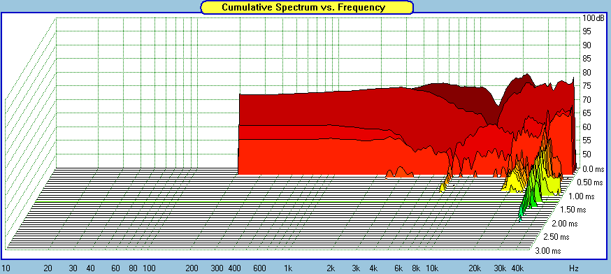 None of the drivers in this system want to do much work in the lower treble, making the midbass seem even louder. This could be considered a full baffle step design, however there is no baffle step compensation built into the crossover - it's all in the woofer's massive inductance. There is really not much problem in the non-linear distortion of the drivers. While not great in that regard, they are acceptable. This system's coloration is primarly in the frequency response. Some of it could also be in enclosure vibration, but I did not break out an accellerometer to prove it.