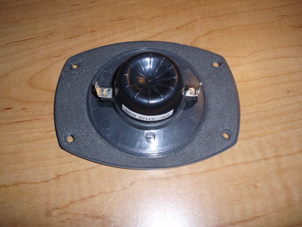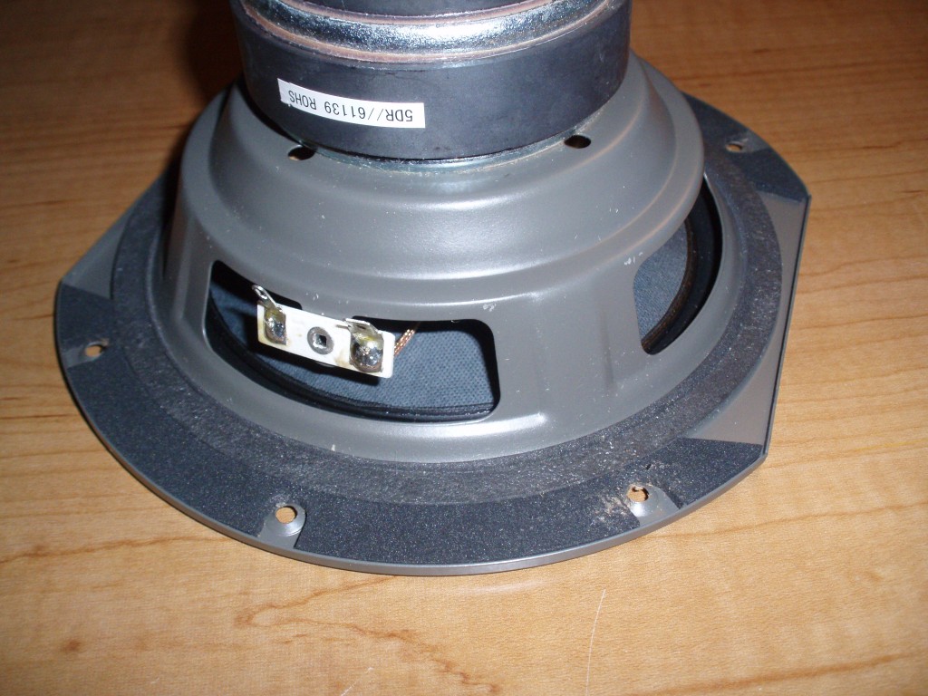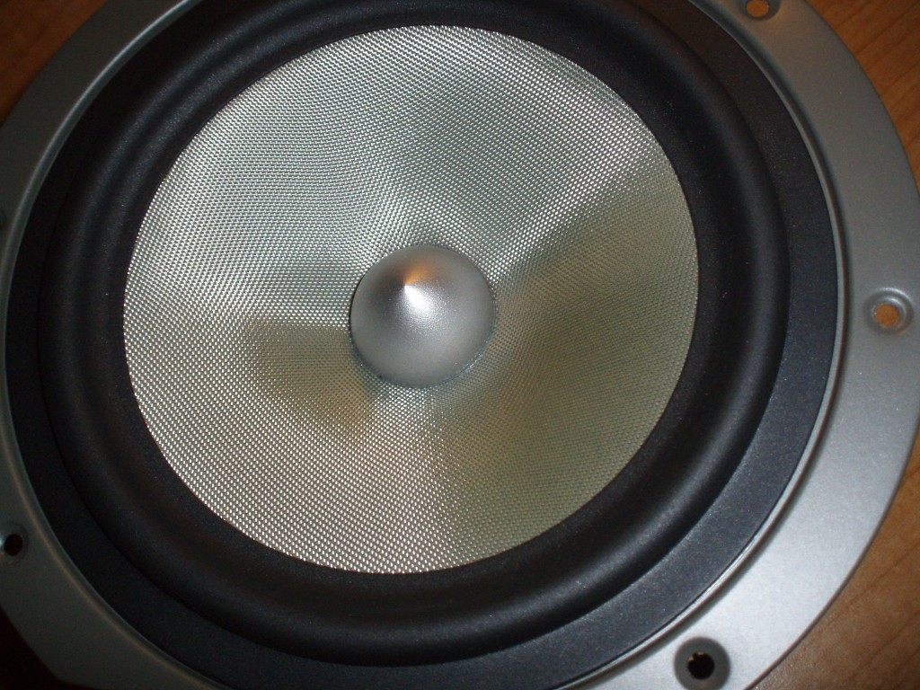 The woofer seems to be a paper base with the gray textured fiberglass adhered to the front side. The cone has a curved profile and seems relatively thick and stiff. The dustcap is a sharp parabolic shape and painted silver. Could be visually mistaken for a phase plug and that's probably the idea. The frame is stamped steel of a flimsier thickness than most stamped frames. The magnet is tiny and there is no ventilation of any kind anywhere. The tweeter is a smallish neo, though size is no judging point for quality. There seems to be a ring glued to the inside of the perforated grill. The tweeter has a fabric surround and appears to have a rear chamber.