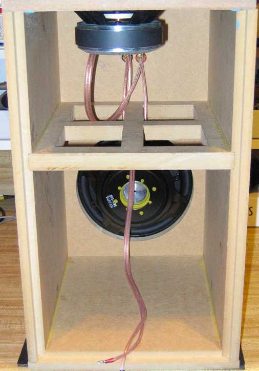Here's a picture with the brace installed, the box side panels glued and the passive radiator installed. Don't be confused by the driver at the top. I set the front baffle on the top of the box to take the picture. It is just a straight-forward, typical box, but the whole point of this project was to keep it simple and see how much bang-for-the-buck one could extract from a set of drivers such as these.