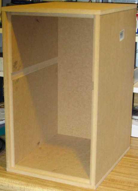 There is certainly more than one way to construct a box. When using Medium Density Fiberboard (mdf), a plain butt-joint is actually a fairly good one when glued well. As you can see in the picture below, the sides and back baffle are all cut from one length of mdf. The sides have been routed to match the dimensions of a Parts Express 0.75 ft³ front baffle that can be purchased separately if desired. That was the option I took, so that the measurements included the roundover of the Parts Express baffle. It was also easier.