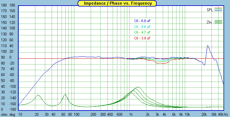 Tweeter lower rolloff adjustment - If you'd like to reduce the output between 2.5 and 4kHz, C6 could be made a smaller value. Default for smoothest response is 6.8 uF, but 5.6, 4.7 and 3.9 are options that increasingly reduce the lower treble output. In a large or highly reflective room, this and/or the response shaping option above may help. Note that as C6 get smaller, the effective listening axis begins to tilt down. Seeing as the vertical listening window is very tall and tilted up a bit by design, you will not have to worry about this.