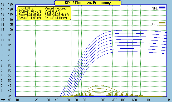 With teeny weenie drivers like this, nothing is of bigger importance than power handling. The charts above are power doubling, starting at 1 watt, then 2 watts, then 4 watts, and on up to 128 watts. Careful, the 3mm Xmax shows up quickly. Running full range, don't expect to pump more than a few watts into it. You will exceed Xmax with 8 watts at 90hz. A Sonic Impact T-amp would make a nice combo for a nearfield or low level listening system. But for home theater or any other "room filling" sound, you had better start paying attention to the subwoofer crossover if you expect to get any reasonable loudness out of this system. Note: Thanks to John Kreskovsky for showing me how to set up filters in the Soundeasy enclosure design module so I can accurately look at Xmax issues when used with a sub.